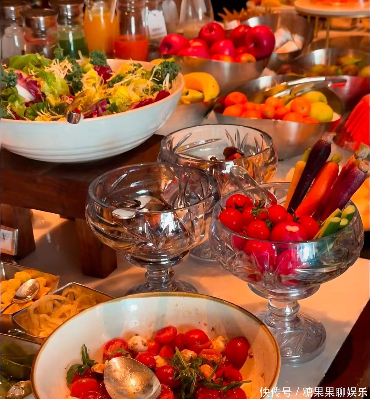 晚上则是去了一个装潢非常高端的酒店吃了一顿丰盛的水果沙拉,她还表示一切都是因为和爱的人分享所以才会变得更香甜。